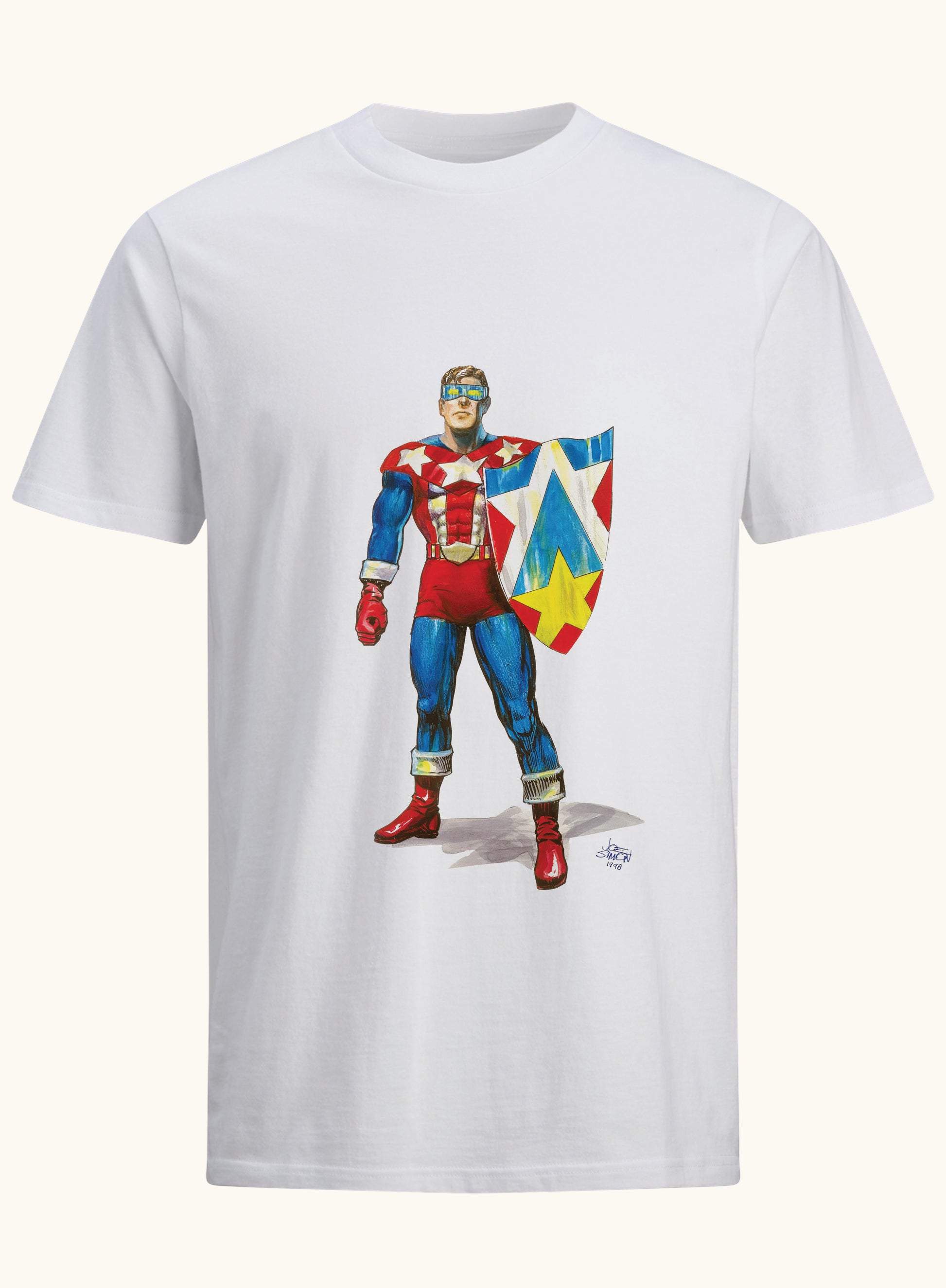 Prototype art by Joe Simon for our ShieldMaster prototype Graphic T-Shirt.